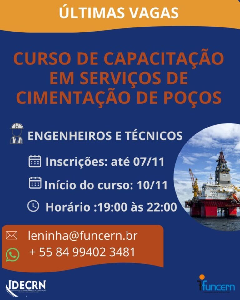 Em parceria com o IDECRN, FUNCERN, PetroReconcavo e SLB, este curso visa qualificar profissionais para atuar na área de cimentação de poços de petróleo. O curso oferece aulas teóricas e práticas, ministradas por professores e especialistas renomados, cobrindo desde os princípios da engenharia de poços até novas tecnologias aplicadas à cimentação.